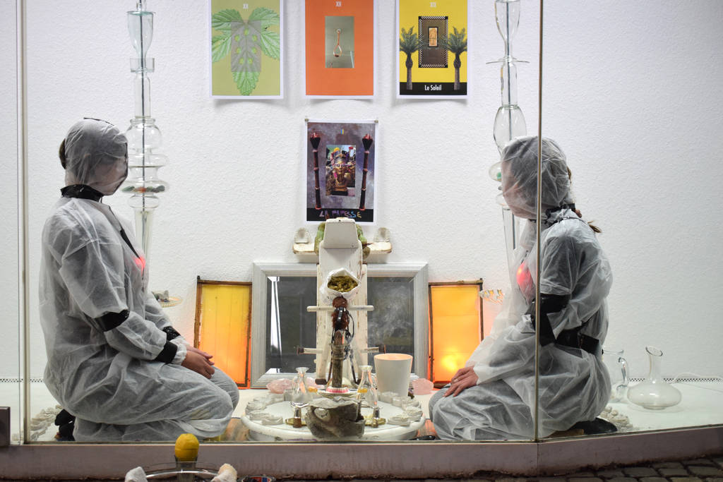 Durch die langsamen Bewegungen wirkt der Auftritt wie eine spirituelle Andacht. Sie berühren die Gegenstände, die im Schaufenster aufgestellt sind, füllen Wasser in kleine Krüge und malen ihre Körperumrisse an das Glas. Die Studentinnen sitzen sich während der gesamten Performance schweigend gegenüber und halten immer wieder Inne, um das Geschehen wirken zu lassen. Welche Aussage der Auftritt im Enddefekt haben soll, lassen die Künstlerinnen offen. "Ich finde es spannend, welche Schlüsse die Leute daraus ziehen", sagt Aniela Guse. "Für jeden sollte es etwas anderes bedeuten."