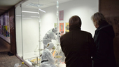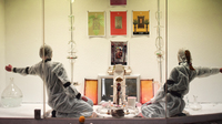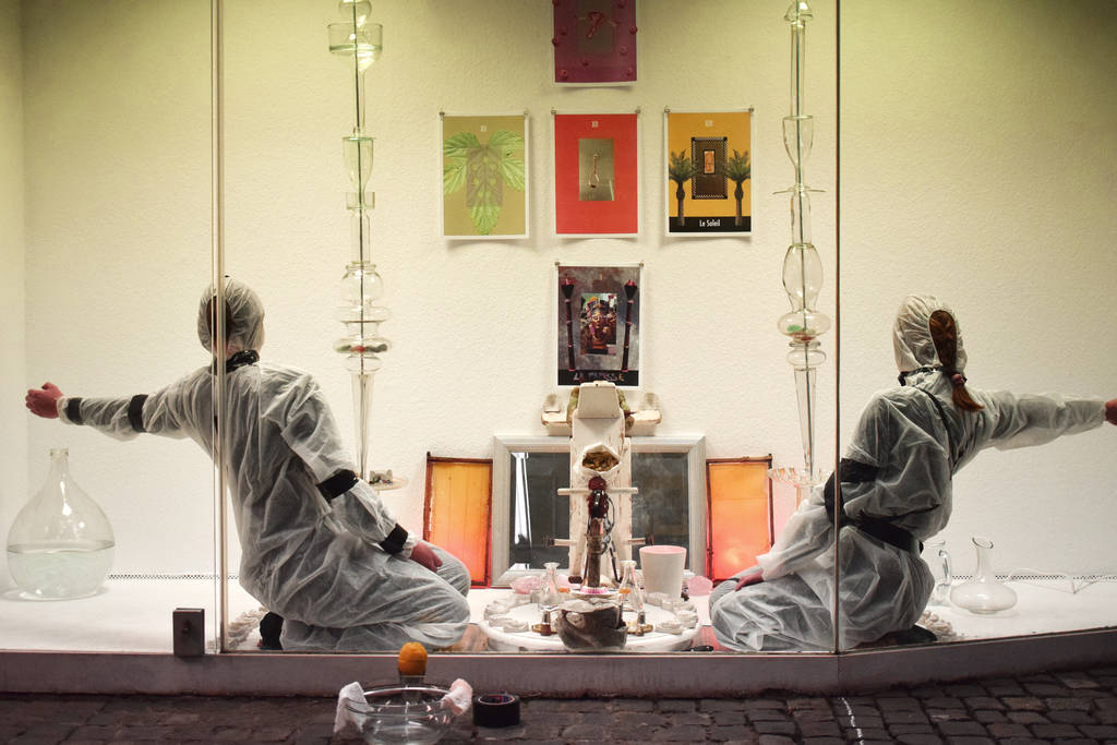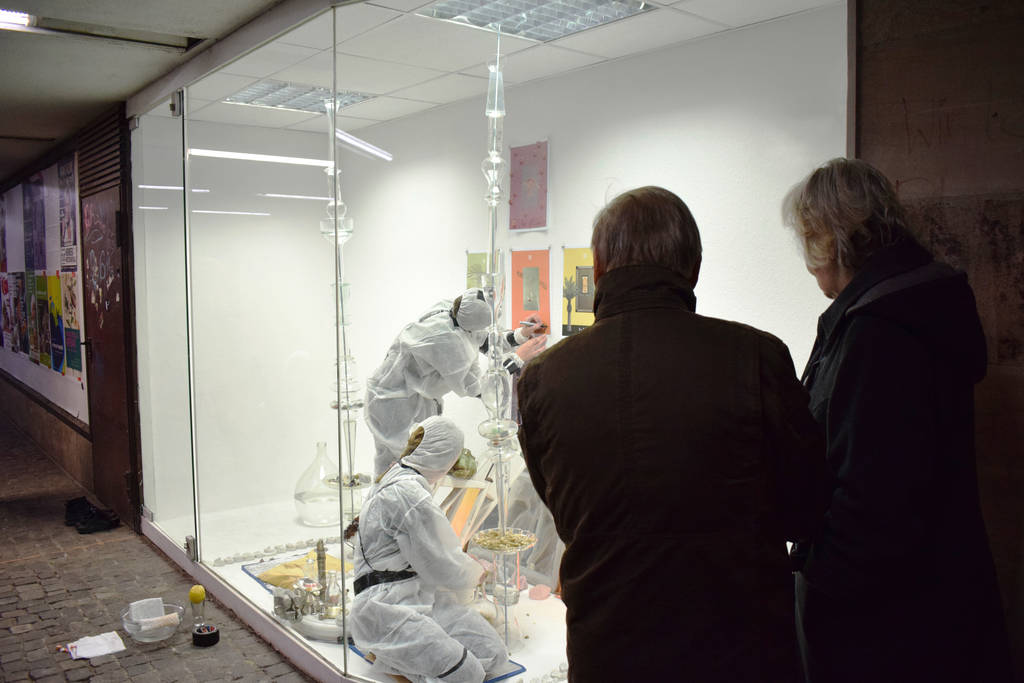 Cathérine Lehnerer und Aniela Guse wollen noch einen Schritt weiter gehen. Eine Performance im Schaufenster soll es sein. Dabei sind der Kreativität keine Grenzen gesetzt. Mit Einweg-Anzügen und vermummten Gesichtern steigen die beiden Hand in Hand durch die Öffnung in das Innere des Fensters. Es herrscht eine bedächtige Stille unter den Zuschauern. Immer wieder bleiben Passanten neugierig stehen.