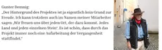 Der Hintergrund des Projektes ist ja eigentlich kein Grund zur Freude. Ich kann trotzdem auch im Namen meiner Mitarbeiter sagen „Wir freuen uns über jeden Ort, der dazu kommt. Jedes Land und jeden einzelnen Stein“. Es ist schön, dass durch das Projekt immer noch eine Aufarbeitung der Vergangenheit stattfindet. Also gerade bei Behinderten-Morden: Die Enkel, die plötzlich fragen „Warum hatten wir nie eine Oma?“. Durch dieses Nachfragen kommt heraus, was damals passiert ist.