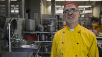 Martin Winkhaus ist seit fast 30 Jahren Koch. Der 58-Jährige wohnt selbst nicht auf dem Tempelhof, arbeitet dort aber seit 2015. Ein Besuch in der Großküche.